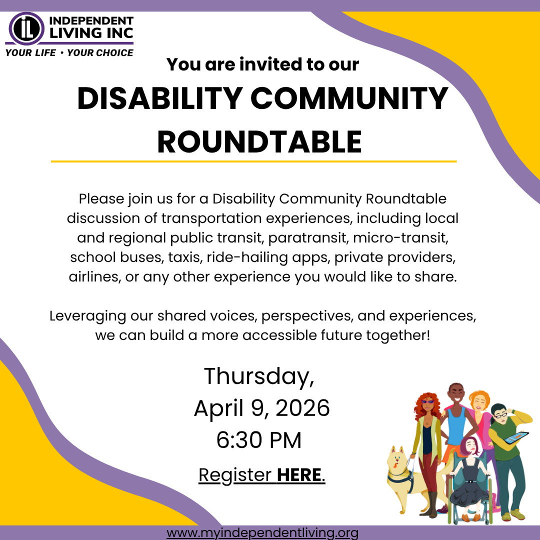 Independent Living, Inc. invites you to join our Disability Community Roundtable, a virtual discussion focused on accessible and disability-competent transportation systems.